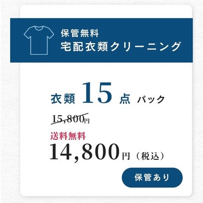 【送料無料】レギュラーコース衣類15点パック(保管あり) ツイートする シェアする 販売価格: 14,800円(税込み) 会員価格 (税込み) 通常価格 15,800円(税込み) 在庫 商品コード hokan-15 JANコード 保管期間をお選びください。 2026年6月迄 2026年7月迄 2026年8月迄 2026年9月迄 2026年10月迄 2026年11月迄 2026年12月迄 2027年1月迄 2027年2月迄 2027年3月迄 2027年4月迄 2027年5月迄 発送時期をお選びください。 上旬(1日頃~15日頃) 下旬(16日頃~30日頃) 数量 - + ※会員登録なしでもご注文可能です! カートに入れる 個別送料 0円